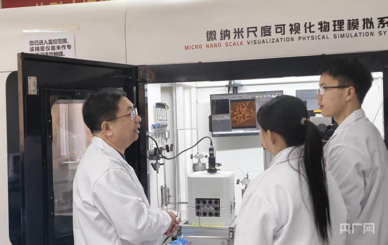 吳景春(左一)與團隊成員正在討論頁巖油采收技術(央廣網(wǎng)記者 陳顯春 攝)