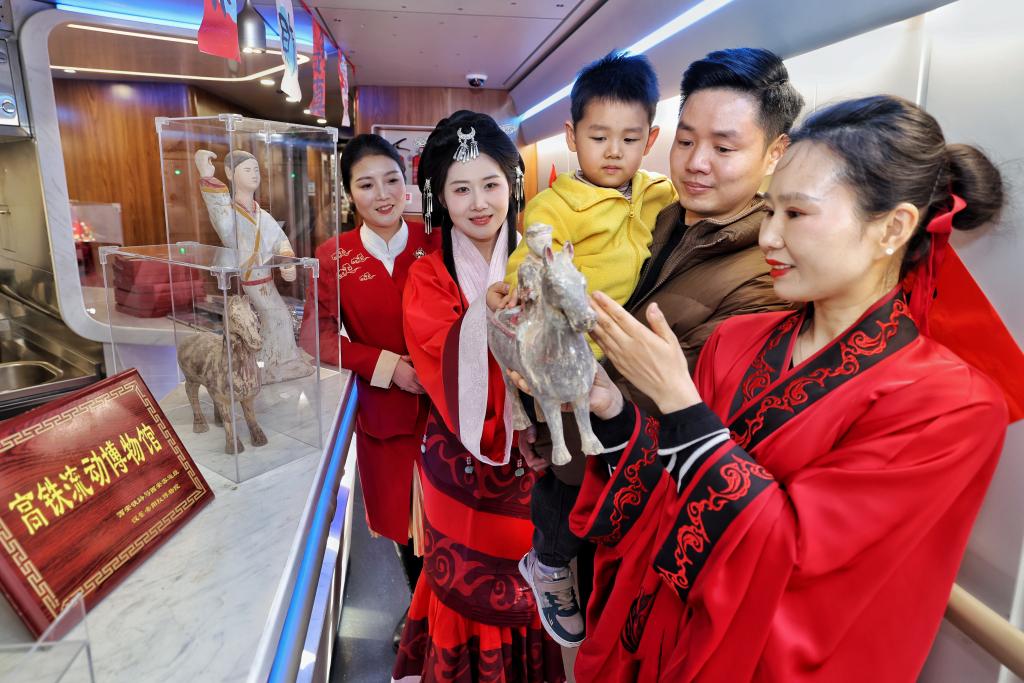 2月11日,西安北開(kāi)往香港西九龍的G916次陜港高鐵列車上,身著漢服的工作人員向旅客展示漢代馬形文物復(fù)制品,并講解相關(guān)歷史文化。(國(guó)鐵西安局集團(tuán)公司供圖)