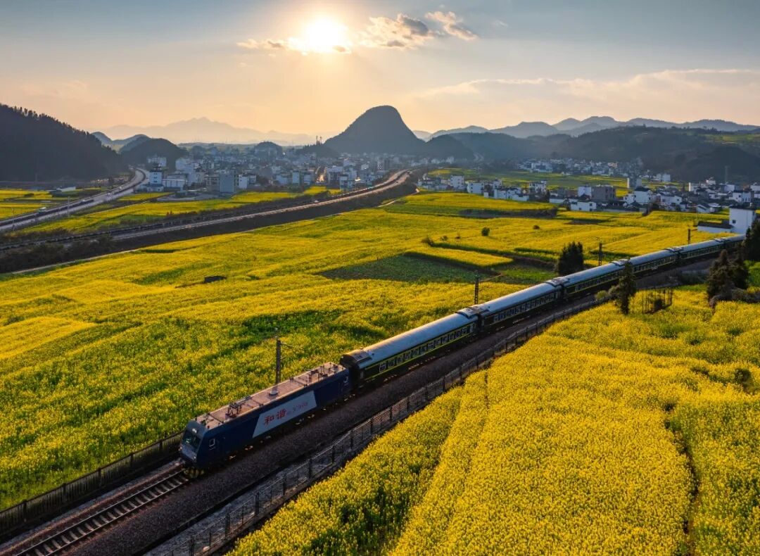 南昆鐵路的春運旅途,被羅平的油菜花海溫柔包圍。暖陽下,列車如游龍穿梭在無邊金浪里,花潮隨春風起伏,暈染出層層柔光。遠山含黛,村落隱在花影間,花香混著歸鄉(xiāng)的期盼,讓每一段歸途都盛滿春日的浪漫與溫暖。