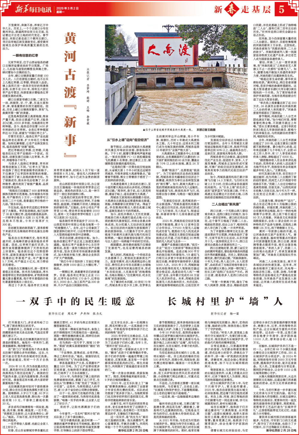 如今,依托豐厚的人文歷史資源,芮城縣已將大禹渡打造成占地450公頃的黃河風(fēng)景游覽區(qū),并將全縣景點(diǎn)串珠成線,充分挖掘人文經(jīng)濟(jì)的發(fā)展?jié)摿Α5涂战?jīng)濟(jì)的興起則為游客提供了新的旅游體驗(yàn),人們置身于空中,低空視角下的黃河古渡風(fēng)貌與現(xiàn)代機(jī)場(chǎng)交相輝映,一幅壯美畫(huà)卷徐徐展開(kāi),猶如與古人進(jìn)行一場(chǎng)跨越千年的時(shí)空對(duì)話。