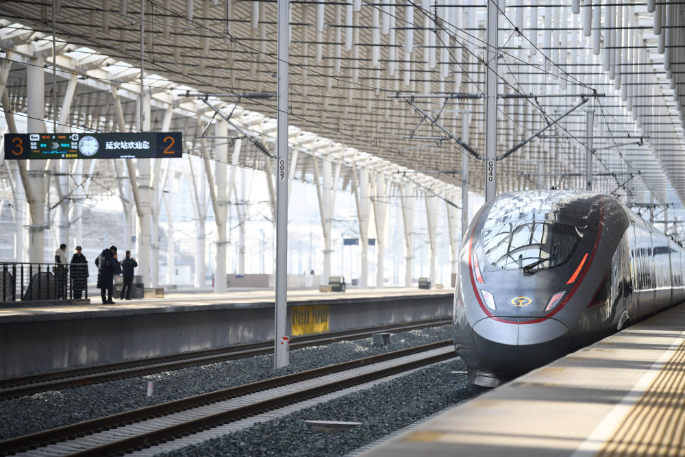 2025年12月26日,西安至延安高鐵開通運(yùn)營。至此,中國高鐵運(yùn)營里程突破5萬公里。這是西延高鐵首發(fā)列車從延安站駛出。新華社記者 張博文 攝