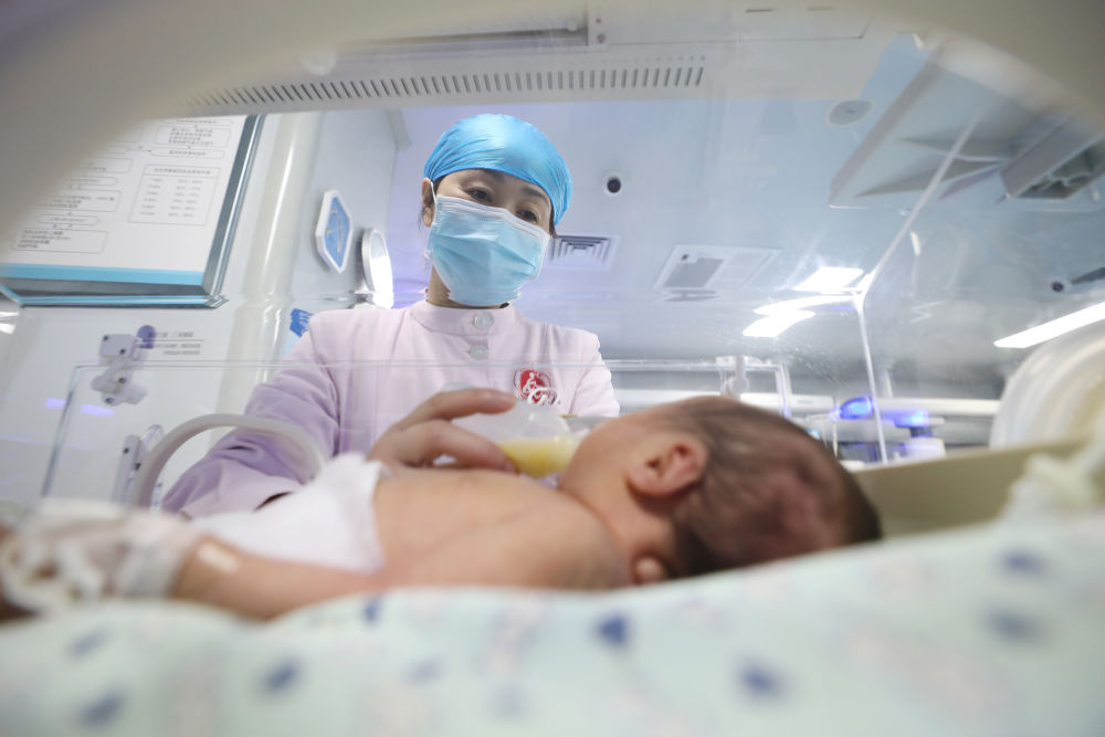2026年1月1日,在河南省焦作市溫縣婦幼保健院新生兒科,護(hù)士為新生兒喂奶。新華社發(fā)(徐宏星攝)