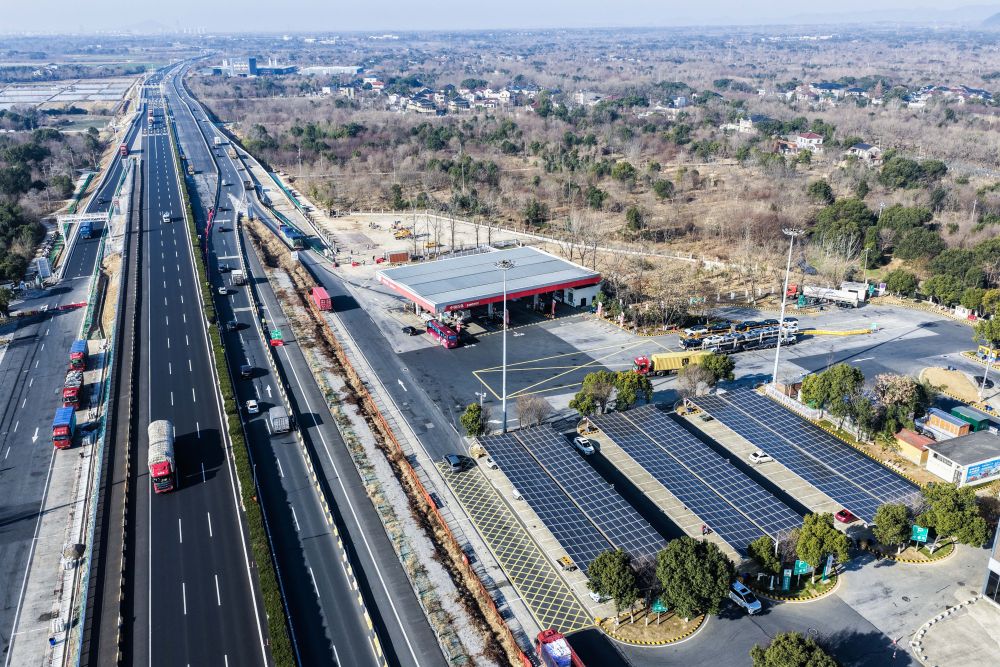 2026年1月7日拍攝的G50滬渝高速長興服務(wù)區(qū)(無人機(jī)照片)。太陽能光伏板下是升級完成的高速服務(wù)區(qū)充電站。新華社記者 徐昱 攝