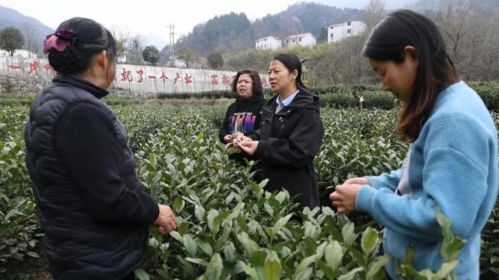 全國政協(xié)委員、安徽省金寨縣花石鄉(xiāng)大灣村黨總支第一書記余靜(右二)在茶園里和茶農(nóng)們交流。(受訪者供圖)