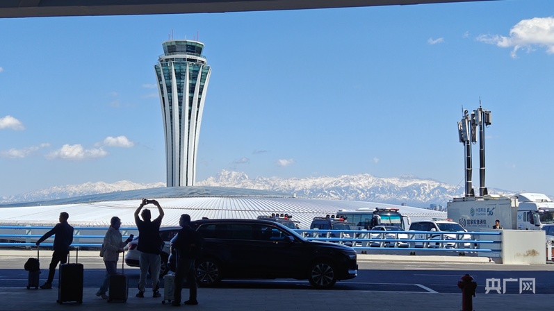 旅客在烏魯木齊天山國(guó)際機(jī)場(chǎng)航站樓前拍照留念 (央廣網(wǎng)記者 郭璁悅 攝)