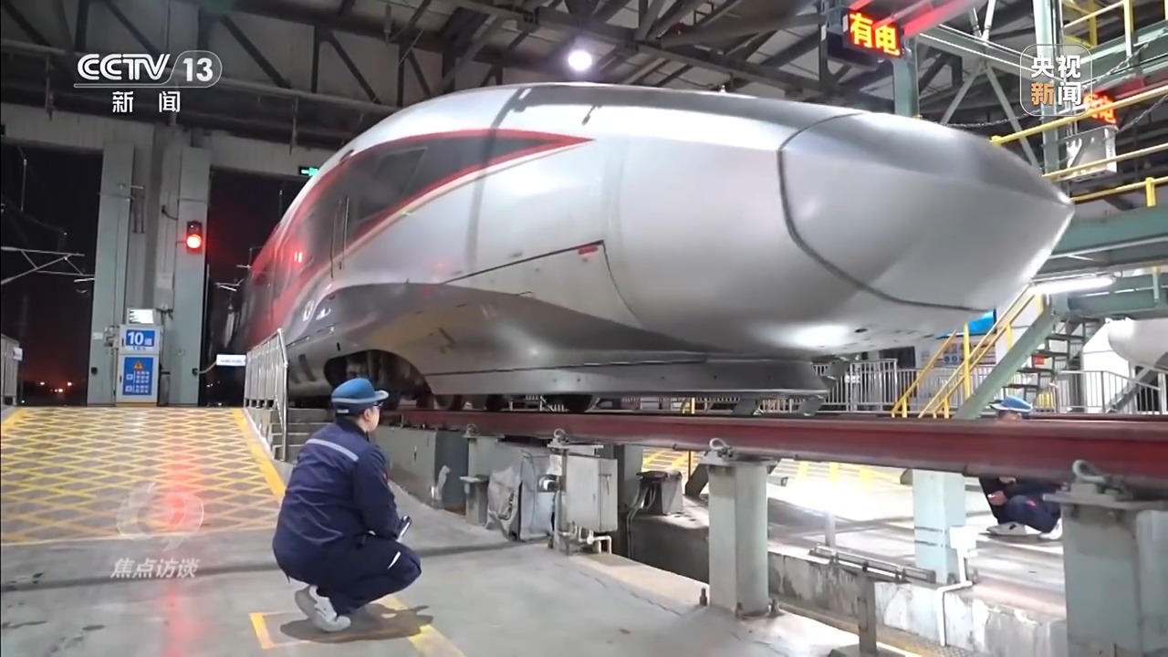 深夜時分,從廣州南站開來的G424次列車緩緩進(jìn)入檢修庫。這是一列16節(jié)編組的復(fù)興號智能動車組,頭一天它從鄭州東站出發(fā)前往廣州南站,又從廣州南站到北京西站,稍作停留后,第二天又開回廣州南站,最后返回鄭州東站。相當(dāng)于兩天的時間,就在大半個中國跑了一個來回。