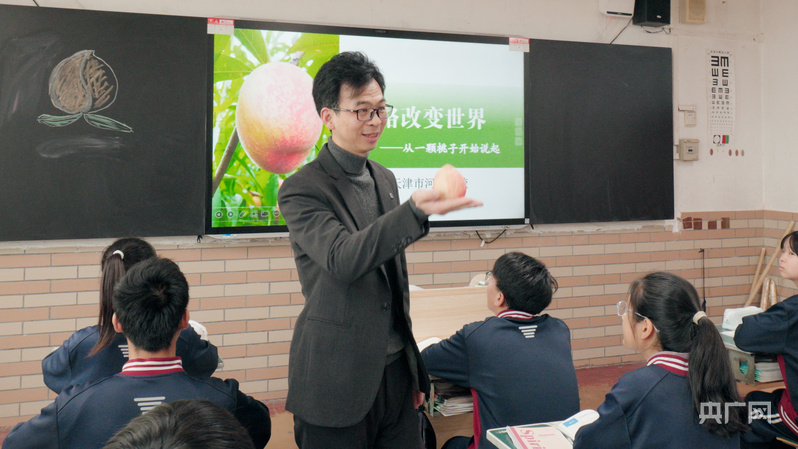 林茂用一顆桃子為道具講解課程(央廣網(wǎng)記者 周思楊 攝)