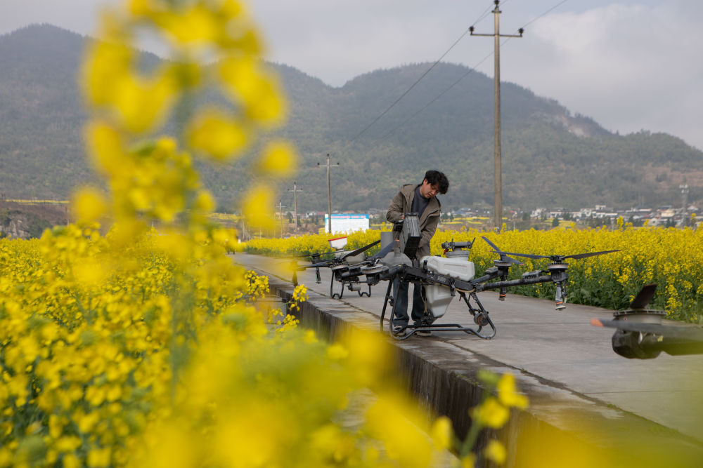 3月10日,在重慶市秀山土家族苗族自治縣清溪場街道油菜種植基地,種植大戶在給無人機(jī)安裝電池,準(zhǔn)備開展“一噴多促”田管作業(yè)。新華社發(fā)(胡程 攝)