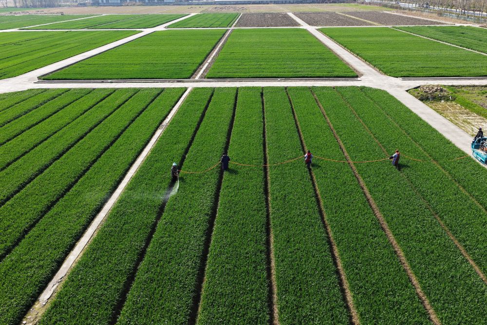 3月10日,農(nóng)民在江蘇里下河地區(qū)農(nóng)科所(揚(yáng)州市農(nóng)科院)的麥田間噴灑農(nóng)藥(無人機(jī)照片)。新華社發(fā)(孟德龍 攝)