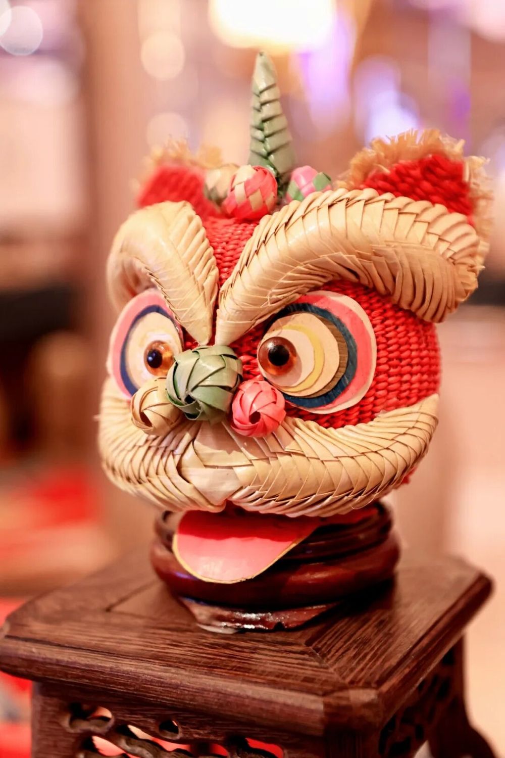 羅志勇棕編作品《醒獅》:選用優(yōu)質(zhì)棕櫚嫩葉經(jīng)過采葉、劃葉、熏葉、泡葉、露葉、曬葉、高溫染色、編制等精心制作而成,作品色彩鮮艷,活靈活現(xiàn)。