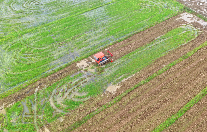 2026年3月20日,在湖南省衡陽市祁東縣金橋鎮(zhèn),村民駕駛農(nóng)機翻耕稻田(無人機照片)。新華社發(fā)(曹正平攝)