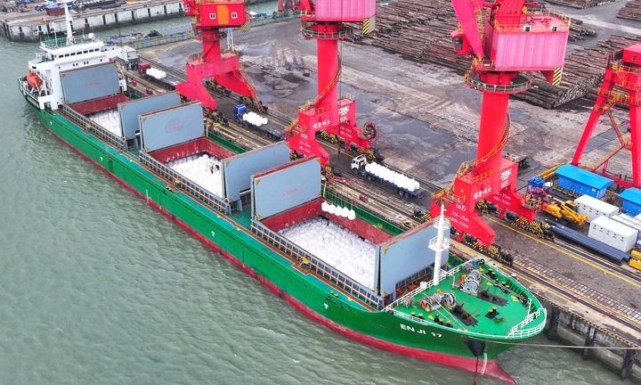 2026年3月18日,在江蘇張家港錦隆重件碼頭,國際航行船舶在泊位上有序卸運進口化肥(無人機照片)。新華社發(fā)(趙國政攝)