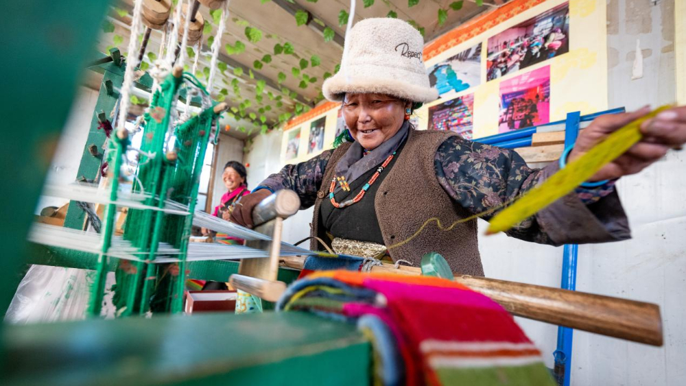 3月25日,西藏日喀則市崗巴縣直克鄉(xiāng)乃村順心合作社員工在編織氆氌。新華網(wǎng) 旦增努布 攝