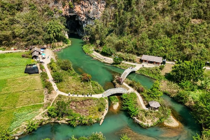 2026年3月17日,游客在云南省文山壯族苗族自治州廣南縣壩美景區(qū)游覽(無人機照片)。近年來,當(dāng)?shù)厣钊胪诰驂蚊来遛r(nóng)文旅融合發(fā)展?jié)摿?,一方面打造沉浸式旅游體驗項目,讓游客在欣賞自然風(fēng)光的同時,感受壯鄉(xiāng)傳統(tǒng)農(nóng)耕文化;另一方面景區(qū)積極吸納本地村民就業(yè),鼓勵其因地制宜創(chuàng)業(yè)增收,推動農(nóng)業(yè)與旅游業(yè)互促共進。新華社記者 彭奕凱 攝
