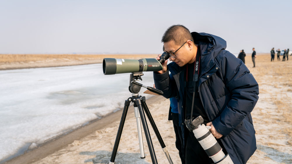 鳥(niǎo)類科研工作者在吉林省白城市鎮(zhèn)賚縣觀察候鳥(niǎo)。新華社記者 唐成卓 攝