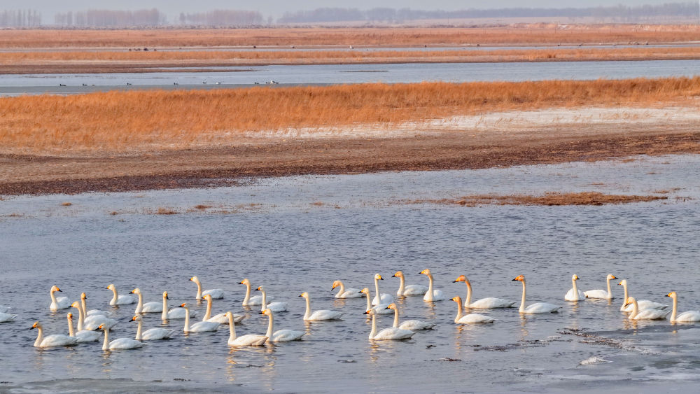 北歸的天鵝在吉林省莫莫格國(guó)家級(jí)自然保護(hù)區(qū)內(nèi)游弋。新華社發(fā)(潘晟昱 攝)