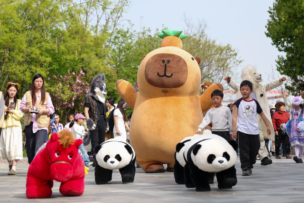 4月4日,游客在湖北省襄陽市華僑城奇幻谷景區(qū)觀看神奇動(dòng)物大遷徙巡游表演。新華社發(fā)(楊東 攝)