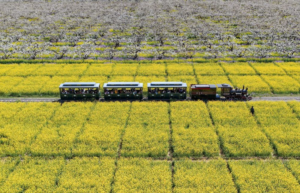 4月6日,游客乘觀光小火車從河北省晉州市周家莊鄉(xiāng)第九生產(chǎn)隊(duì)梨園旁經(jīng)過(無人機(jī)照片)。新華社記者 楊世堯 攝