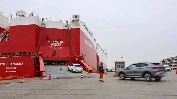 2026年3月24日,在上海外高橋的海通汽車滾裝碼頭,工作人員引導(dǎo)國產(chǎn)新能源汽車駛?cè)肫嚌L裝船。