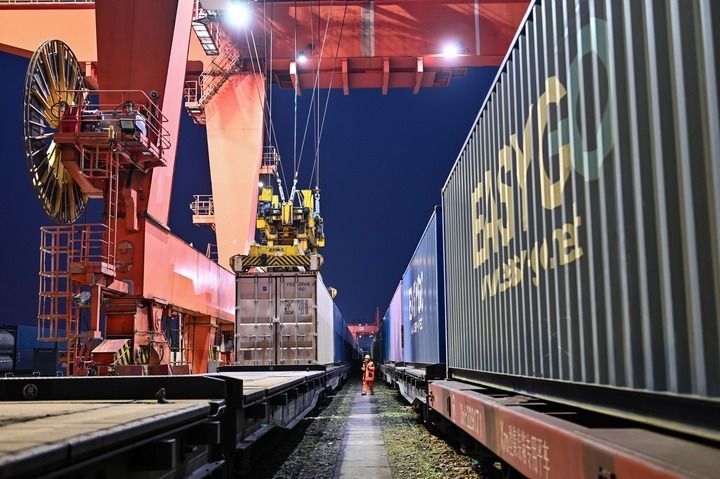 2026年2月16日,貨運員在成都國際鐵路港檢查吊運的中歐班列集裝箱。