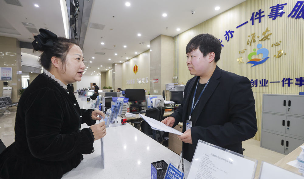 2026年4月9日,在江蘇淮安經(jīng)濟技術(shù)開發(fā)區(qū)政務(wù)服務(wù)中心,市民(左)向工作人員咨詢營業(yè)執(zhí)照經(jīng)營范圍、辦理流程等信息。