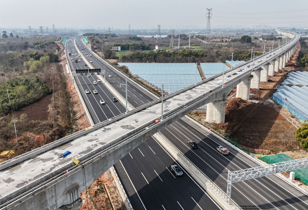 2月10日,成渝中線高鐵四川段橋梁建設(shè)全部完成。這是當(dāng)日在成都市拍攝的成渝中線高鐵最長(zhǎng)橋梁龍泉特大橋跨滬蓉高速公路(無人機(jī)照片)。新華社記者王曦 攝