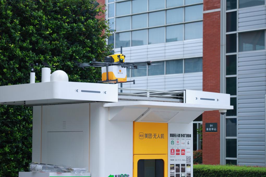 一架美團(tuán)送餐無人機(jī)緩緩?fù)T谏虾J袟钇謪^(qū)的一個(gè)智能空投柜上進(jìn)行送餐。(受訪者供圖)