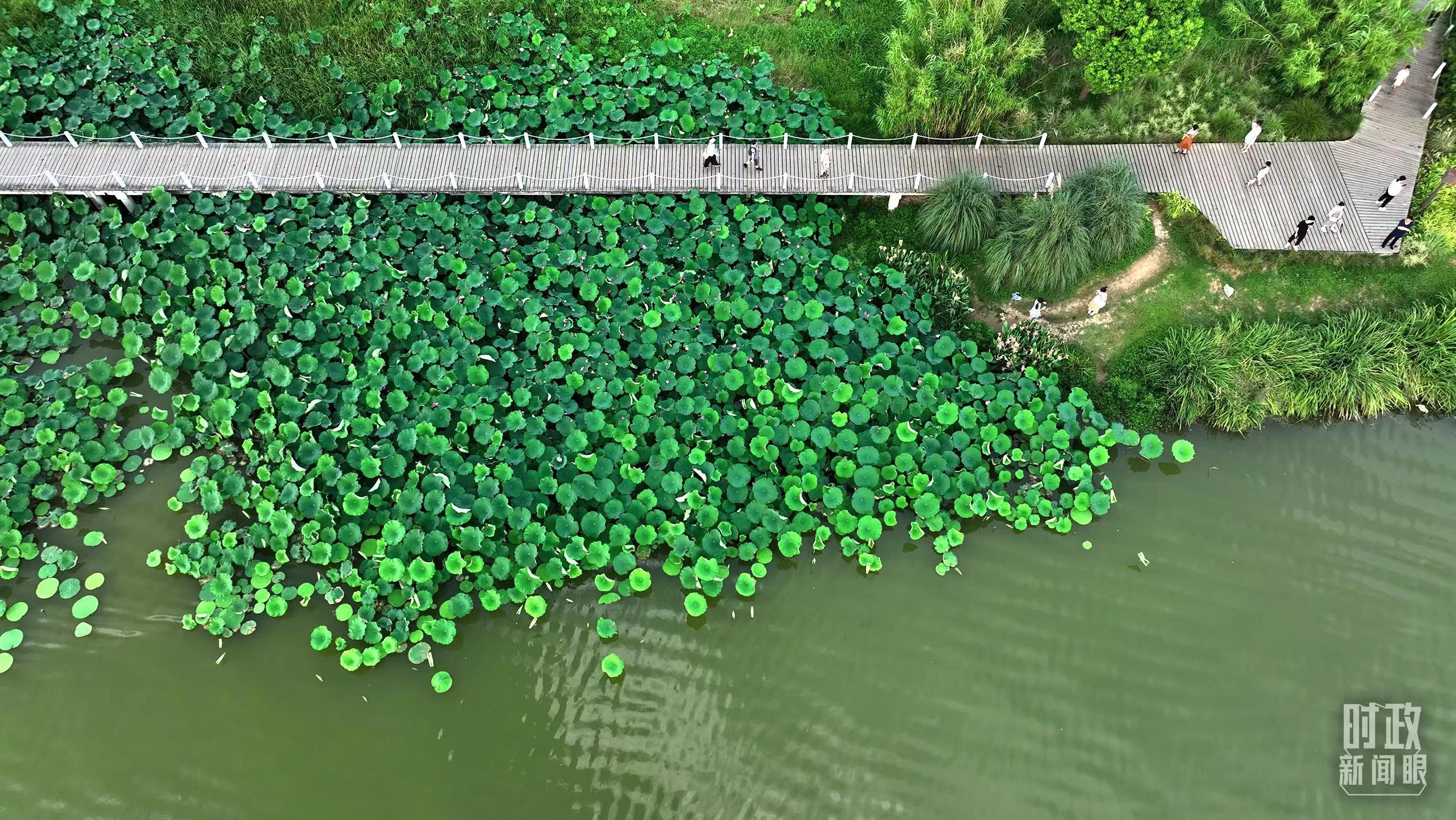 陜西漢中天漢濕地公園內(nèi),游人穿行,荷影婆娑。(總臺(tái)記者劉海濤拍攝)