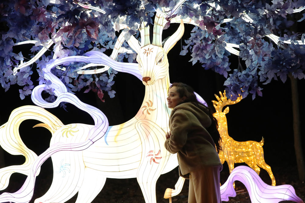 2023年12月14日,一名女子在法國巴黎風(fēng)情園舉辦的“山海有靈”法國豫園燈會上拍照留念。新華社記者 高靜 攝