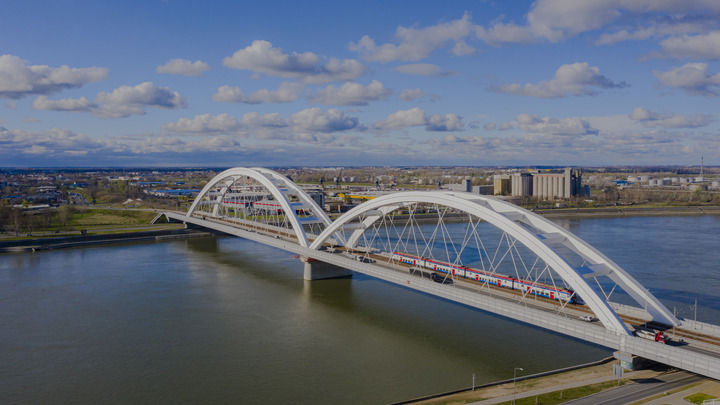 2024年3月12日,一列火車運行在匈塞鐵路塞爾維亞境內(nèi)貝諾段諾維薩德多瑙河大橋上(無人機照片)。新華社發(fā)(任衛(wèi)云攝)