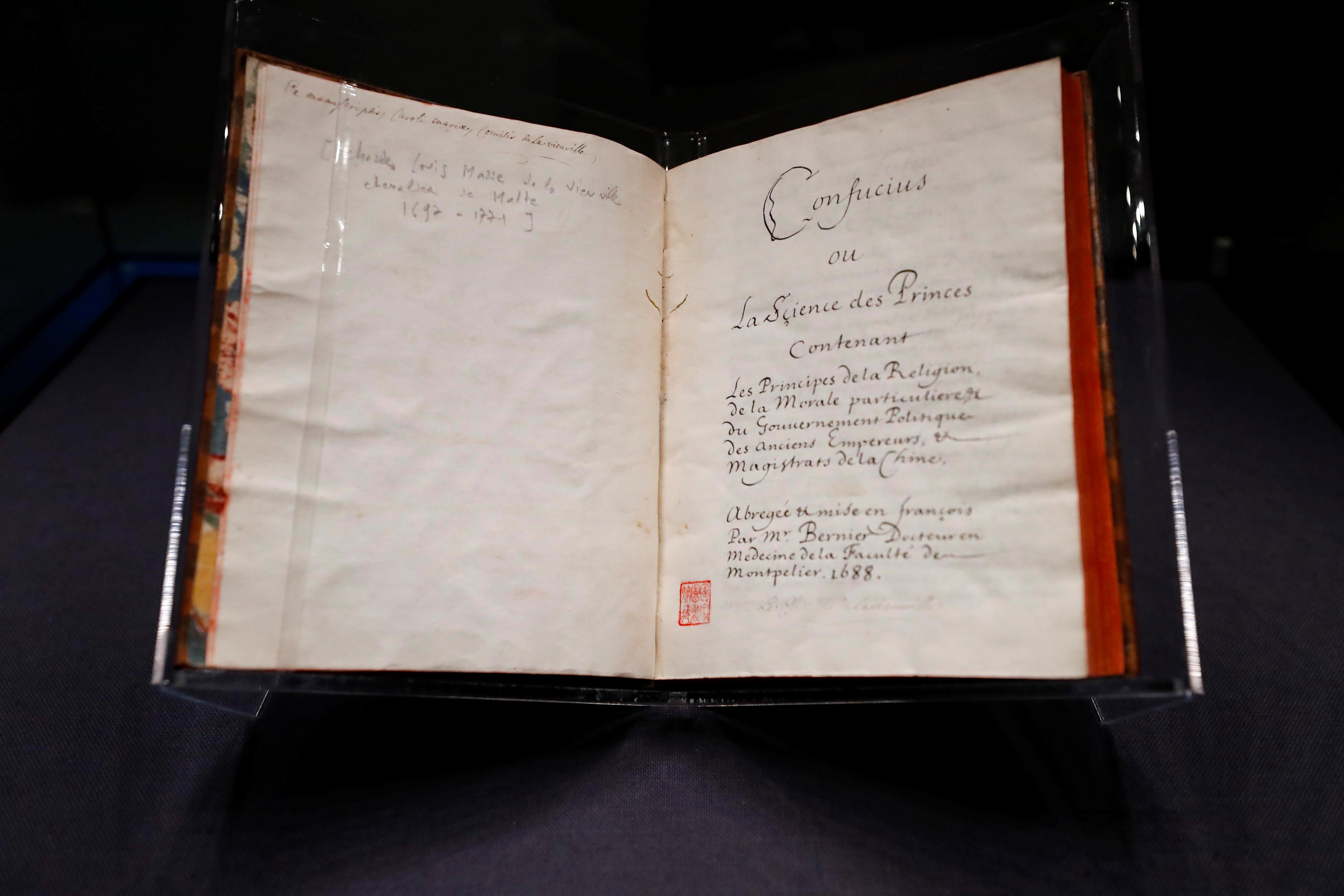 1688年,首部《論語導(dǎo)讀》法文版原著正式出版。牛皮封面、飄口燙金、染紋紙環(huán)襯、書口刷紅……這是一本富有法國啟蒙時(shí)期書籍裝幀特征的古老典籍,世界上僅存兩本。