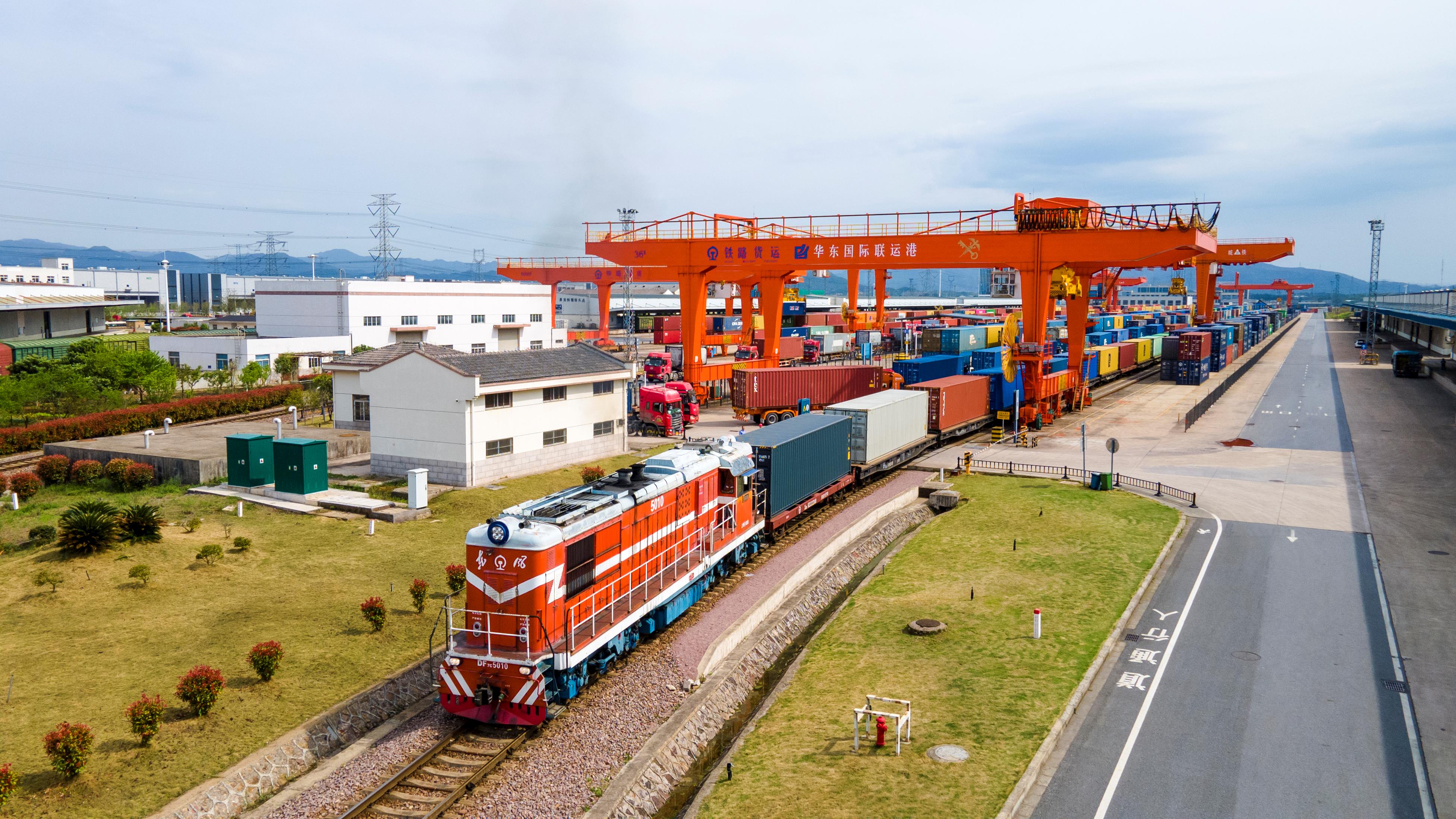 △2024年4月1日,浙江省金華華東國際聯(lián)運(yùn)港,一列中歐班列裝載110個(gè)標(biāo)箱日用百貨、電動(dòng)工具、機(jī)械裝備等貨物從鐵路金華南貨場(chǎng)啟程駛往匈牙利布達(dá)佩斯。