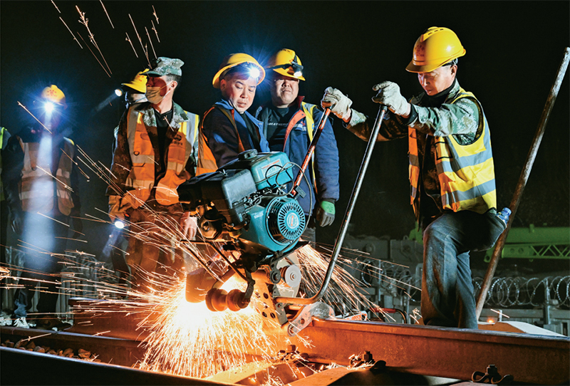 2024年4月10日,在內(nèi)蒙古包頭市,包銀高鐵引入包頭樞紐工程的關鍵控制性工程之一——包西上行線路撥接完成施工。此次施工完成,標志著包銀高鐵引入包頭樞紐包頭站改造工程取得重大進展,為包銀高鐵開通奠定堅實基礎。圖為4月10日凌晨,工人在包西上行線路上作業(yè)。 新華社記者 劉磊/攝