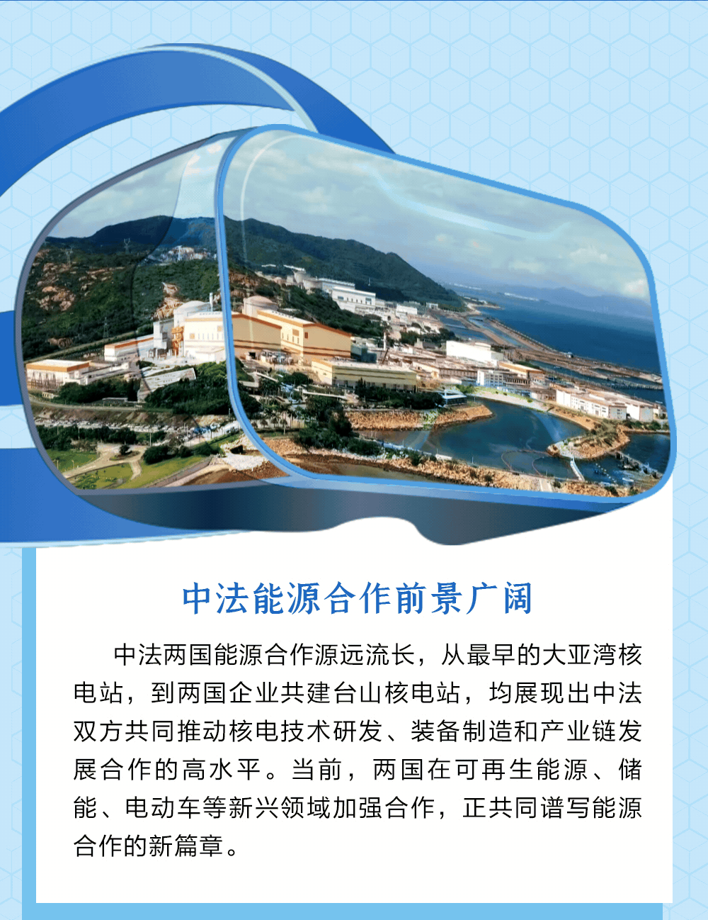 “法國是第一個(gè)同新中國正式建交的西方大國,也是最早同中國建立戰(zhàn)略伙伴關(guān)系和開展戰(zhàn)略對話、最早同中國開展民用核能合作的國家?!绷?xí)近平主席強(qiáng)調(diào),中法是特殊的朋友,共贏的伙伴。