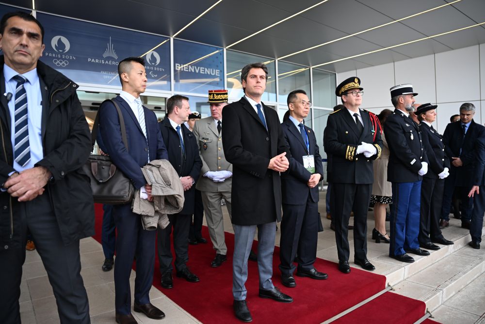習(xí)近平乘坐專機抵達(dá)巴黎奧利機場時,法國總理阿塔爾等法國政府高級代表熱情迎接。