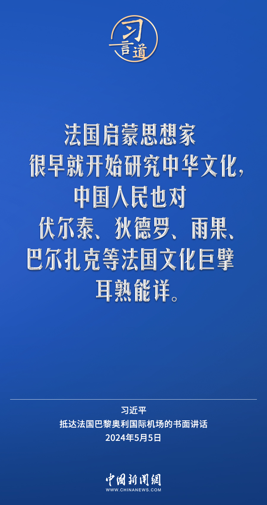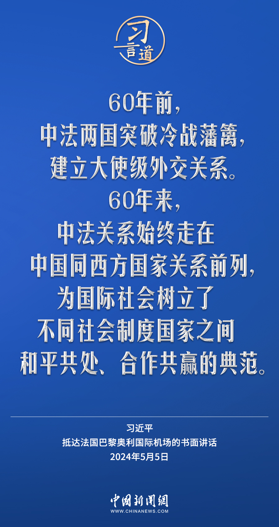 當地時間5月5日下午,國家主席習近平抵達巴黎,開始對法國進行國事訪問。在抵達法國巴黎奧利國際機場的書面講話中,習近平指出——