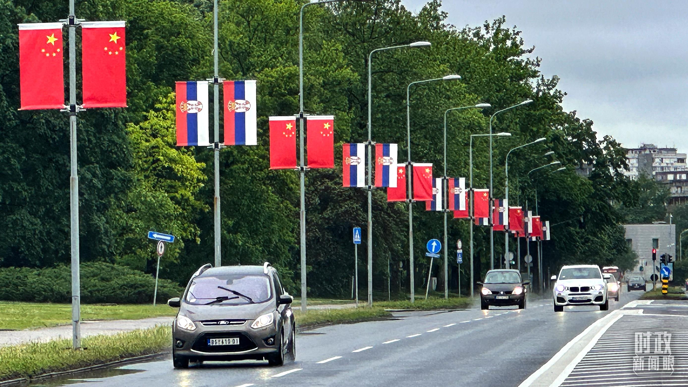 貝爾格萊德的主要街道掛滿五星紅旗,隨風飄揚。(總臺央視記者范一鳴拍攝)