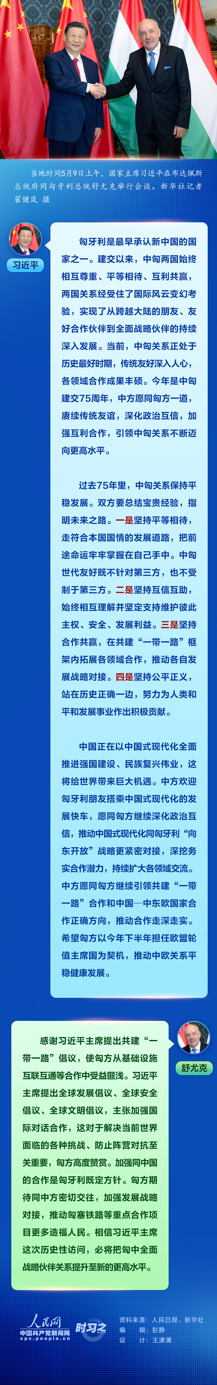 當(dāng)?shù)貢r間5月9日上午,國家主席習(xí)近平在布達(dá)佩斯總統(tǒng)府同匈牙利總統(tǒng)舒尤克舉行會談。習(xí)近平指出,今年是中匈建交75周年,中方愿同匈方一道,賡續(xù)傳統(tǒng)友誼,深化政治互信,加強互利合作,引領(lǐng)中匈關(guān)系不斷邁向更高水平。