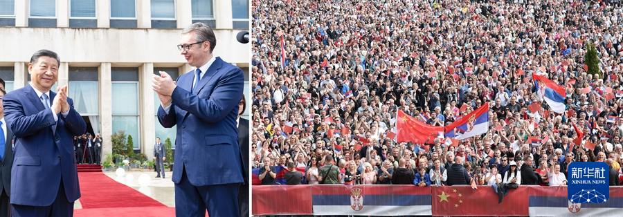會(huì)談前,塞爾維亞總統(tǒng)武契奇陪同習(xí)近平主席來到大廈平臺(tái)。此時(shí),平臺(tái)外的大廈廣場(chǎng)上,友誼的海洋沸騰起來——一萬五千名當(dāng)?shù)孛癖姄]舞中塞兩國(guó)國(guó)旗,齊聲呼喊兩國(guó)國(guó)名,對(duì)遠(yuǎn)道而來的貴客表示最熱烈的歡迎。
