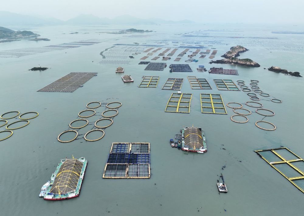 在福建連江定海灣海域,坐落著“閩投1號(hào)”“乾動(dòng)1號(hào)”“定海灣1號(hào)”等深遠(yuǎn)海養(yǎng)殖平臺(tái)。從高空俯瞰,一座座籃球場大小的鋼構(gòu)平臺(tái)臥于海上,大黃魚等養(yǎng)殖品在深?!皶秤尉幼 ?。