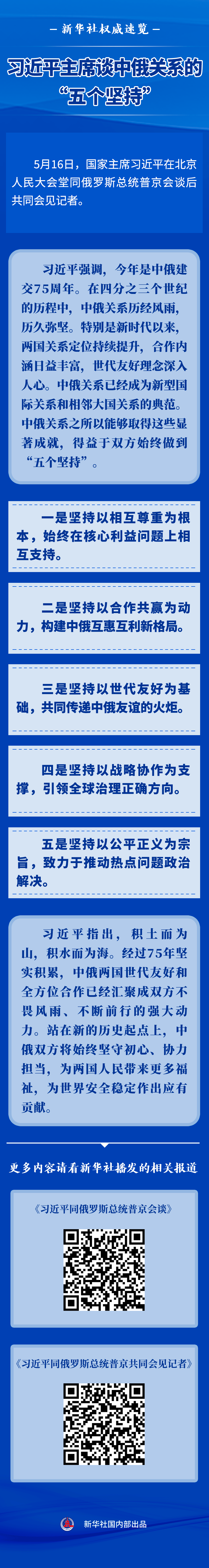 5月16日,國家主席習(xí)近平在北京人民大會堂同俄羅斯總統(tǒng)普京會談后共同會見記者。習(xí)主席談到中俄關(guān)系的“五個堅持”。