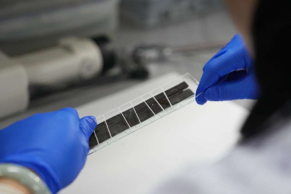 2024年3月4日,工作人員在湖南省文物考古研究院長(zhǎng)沙銅官窯基地封護(hù)簡(jiǎn)牘。