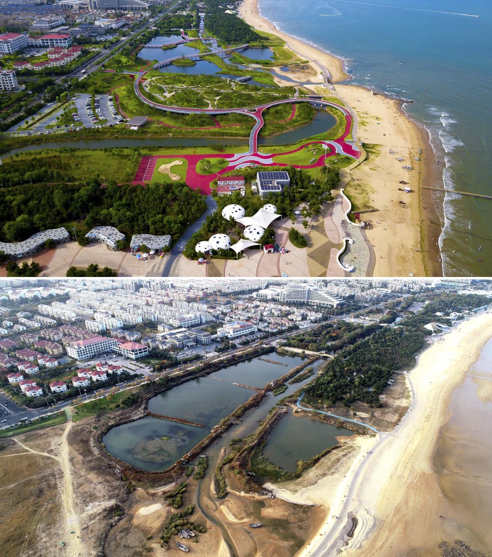 這是一張拼版照片,上圖為2021年拍攝的生態(tài)修復(fù)完成后的山東日照市陽光海岸綠道,該綠道長28公里(無人機(jī)照片);下圖為2019年11月拍攝的日照市陽光海岸綠道未經(jīng)生態(tài)修復(fù)時(shí)的樣子。新華社記者 郭緒雷 攝