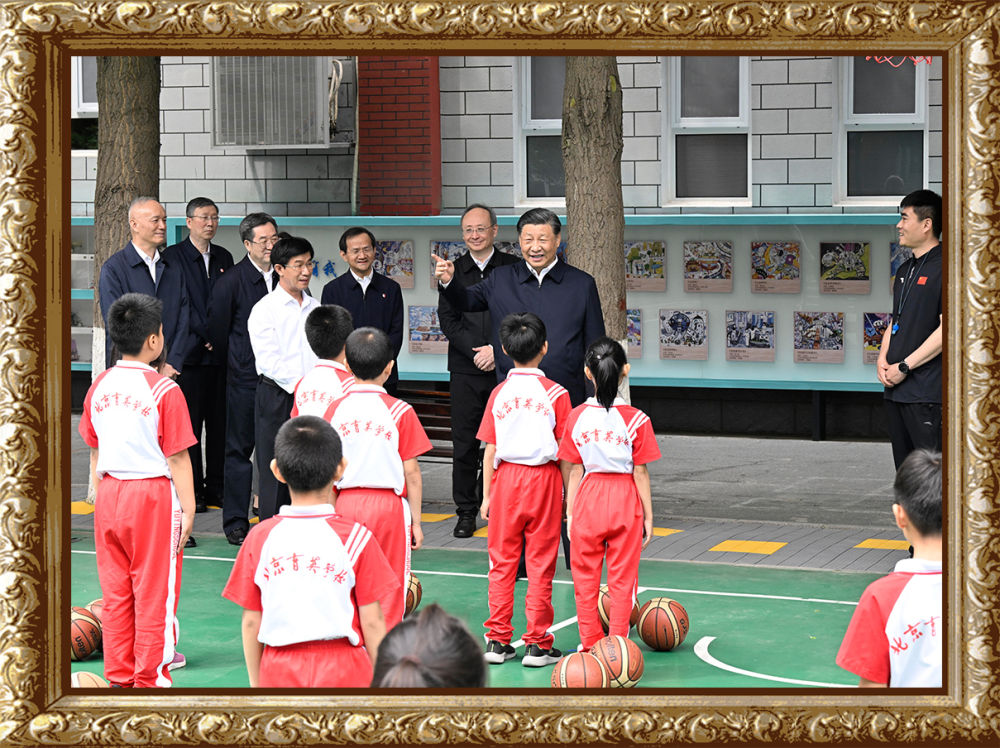 2023年5月31日上午,習(xí)近平總書記來到北京育英學(xué)??赐繂枎熒诨@球場(chǎng)同正在上體育課的小學(xué)生們親切交流。習(xí)近平親切地說:“現(xiàn)在生活條件好了,孩子們不是要吃得胖胖的,而是要長(zhǎng)得壯壯的、練得棒棒的。”