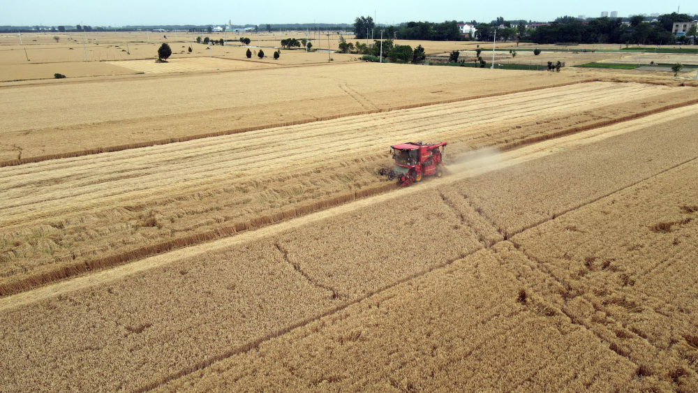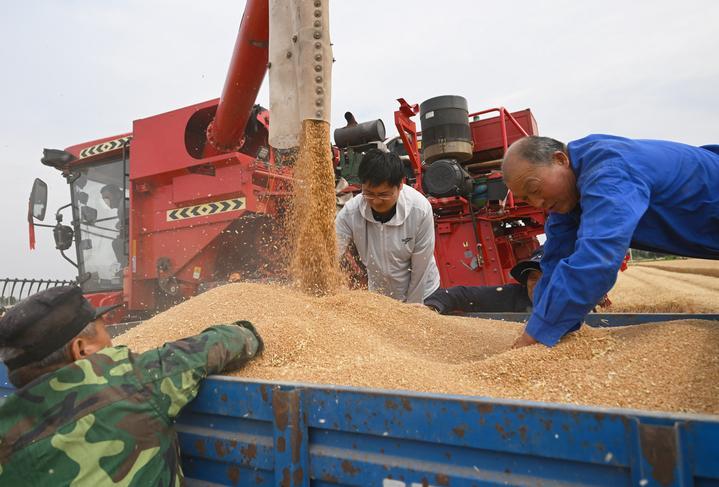 麥收時節(jié),在安徽阜陽太和縣,機器轟鳴,麥浪翻滾如金色綢緞,飽滿的麥粒裝滿一輛輛運糧車的貨廂。