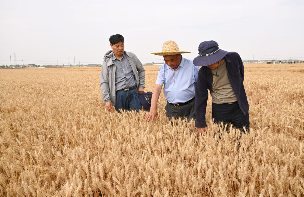 2024年5月29日,在太和縣淙祥現(xiàn)代農(nóng)業(yè)種植專業(yè)合作社,徐淙祥(中)和農(nóng)技專家一起為試驗麥種測產(chǎn)。
