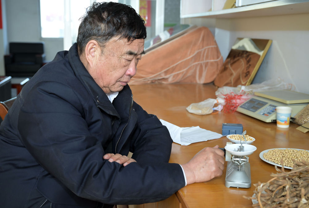 2023年2月21日,在太和縣淙祥現(xiàn)代農(nóng)業(yè)種植專業(yè)合作社,徐淙祥在實驗室里對農(nóng)作物樣品進行稱重和記錄。