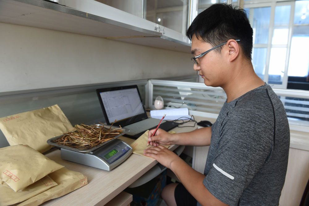 2022年6月28日,在太和縣淙祥現(xiàn)代農(nóng)業(yè)種植專業(yè)合作社,徐旭東在實驗室對農(nóng)作物樣品進行稱重和記錄。