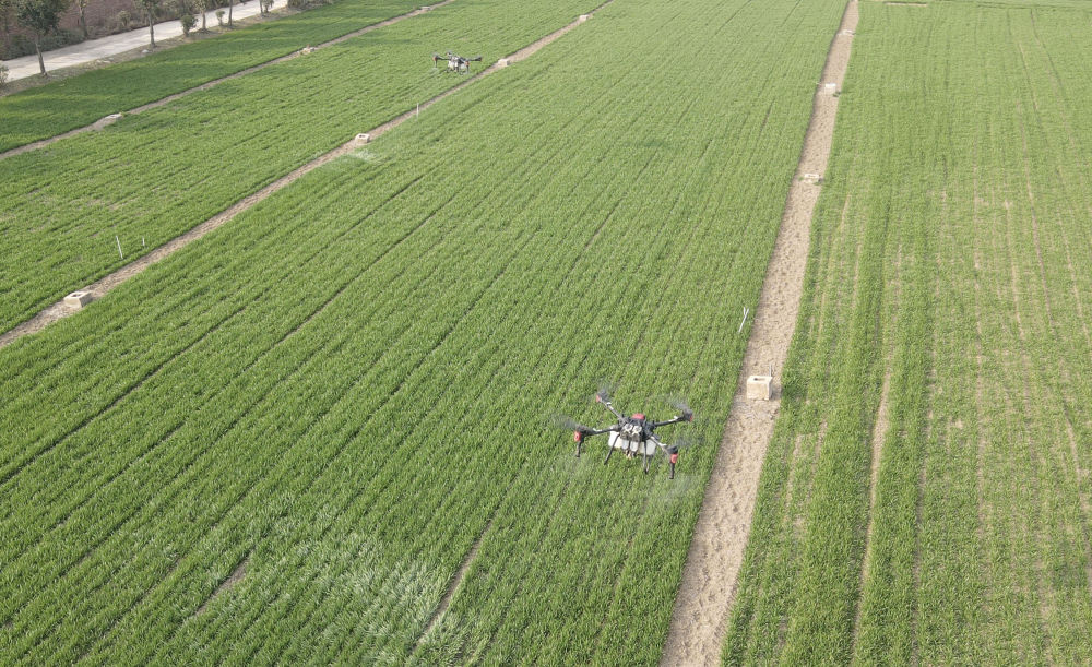 2023年2月21日,在太和縣淙祥現(xiàn)代農(nóng)業(yè)種植專業(yè)合作社,無人機噴灑農(nóng)藥(無人機照片)。
