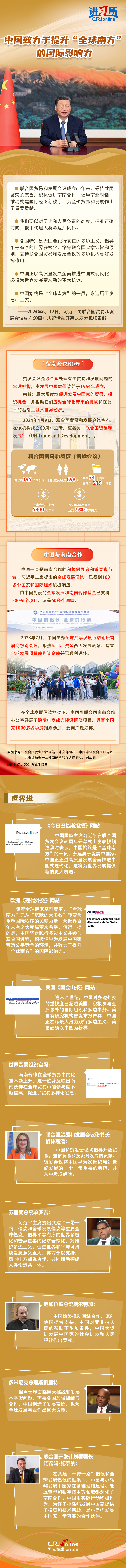 6月12日,中國國家主席習(xí)近平向聯(lián)合國貿(mào)易和發(fā)展會(huì)議成立60周年慶祝活動(dòng)開幕式發(fā)表視頻致辭時(shí)強(qiáng)調(diào),中國正以高質(zhì)量發(fā)展全面推進(jìn)中國式現(xiàn)代化,必將為世界發(fā)展帶來新的更大機(jī)遇。